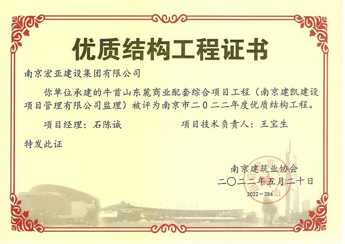 (2022年05月20日)牛首山東麓商業(yè)配套綜合項目榮獲《南京市2022年度優(yōu)質(zhì)結構工程》