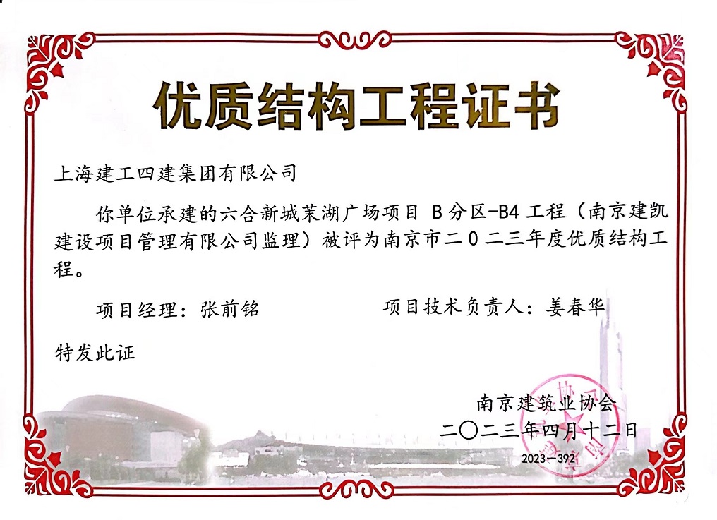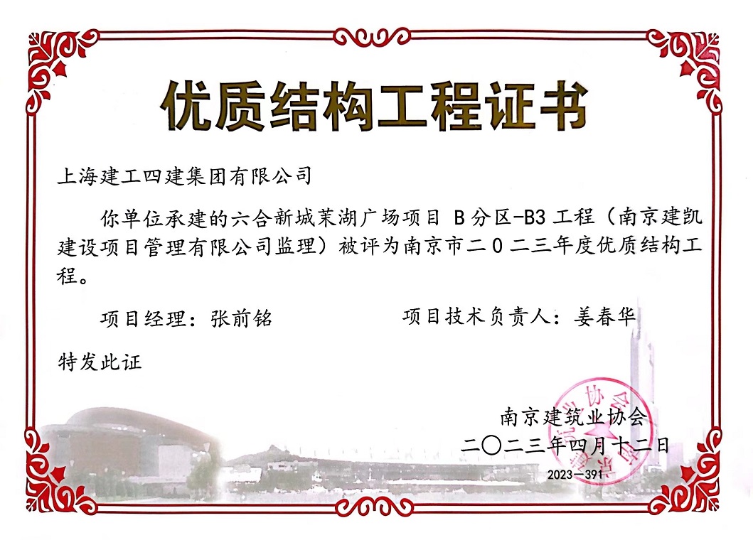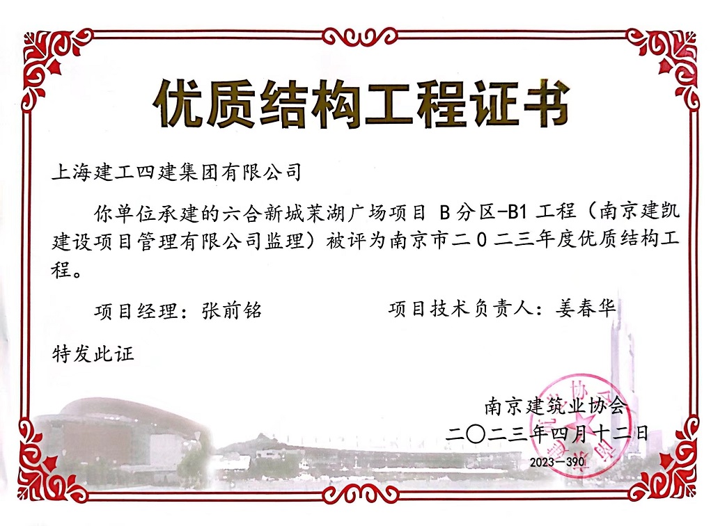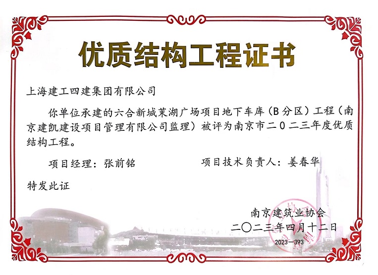 六合新城茉湖廣場(chǎng)項目榮獲“2023年度優(yōu)質(zhì)結構工程”