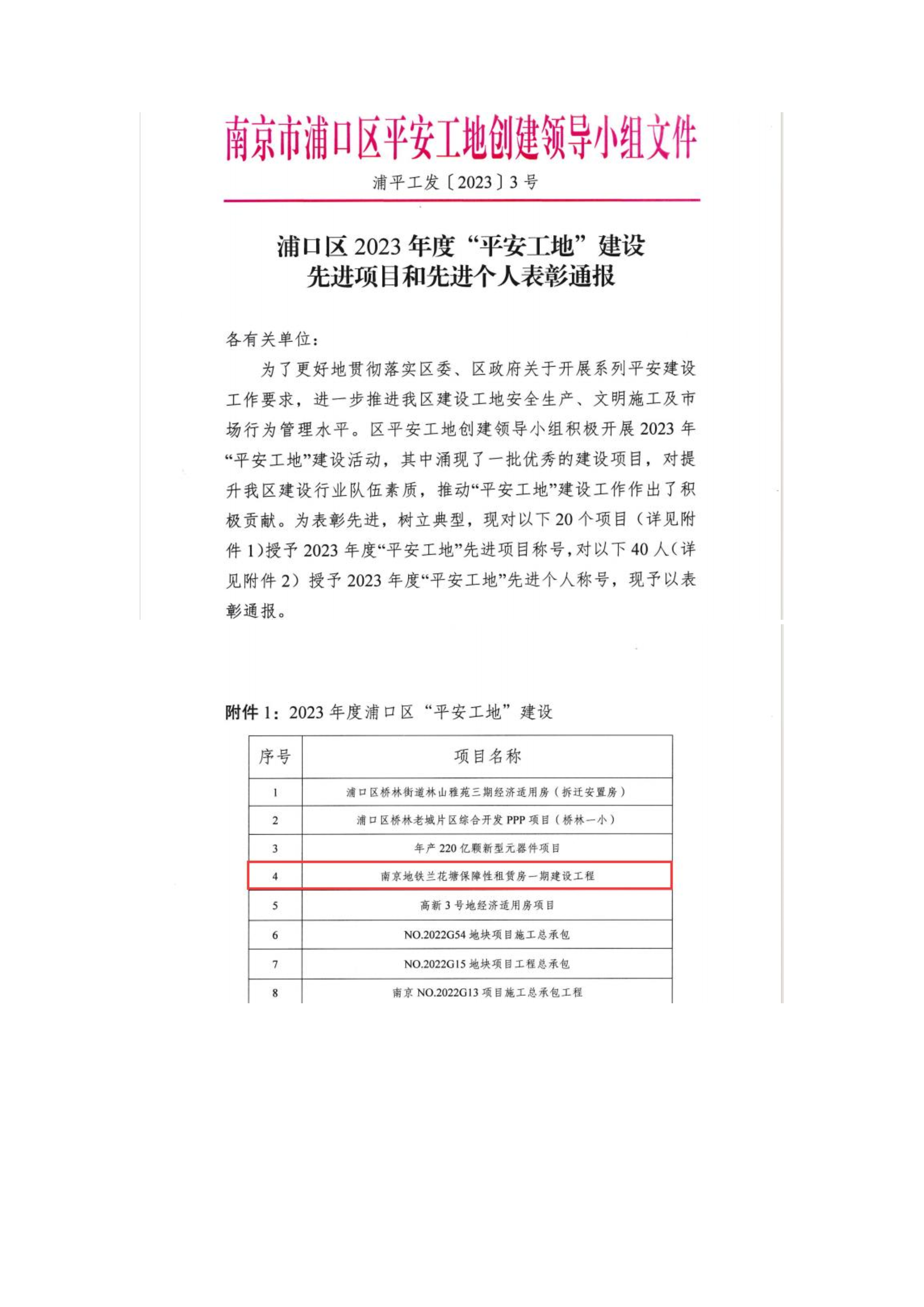 南京地鐵蘭花塘保障性租貨房一期建設工程榮獲“浦口區2023年度“平安工地”建設先進(jìn)項目”