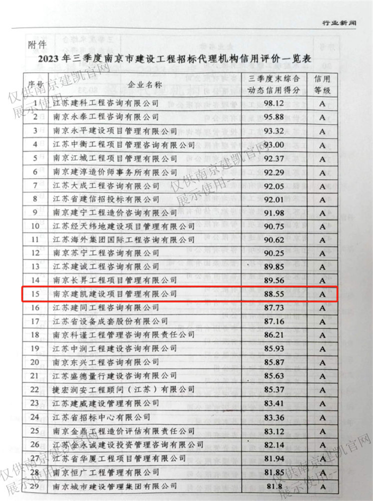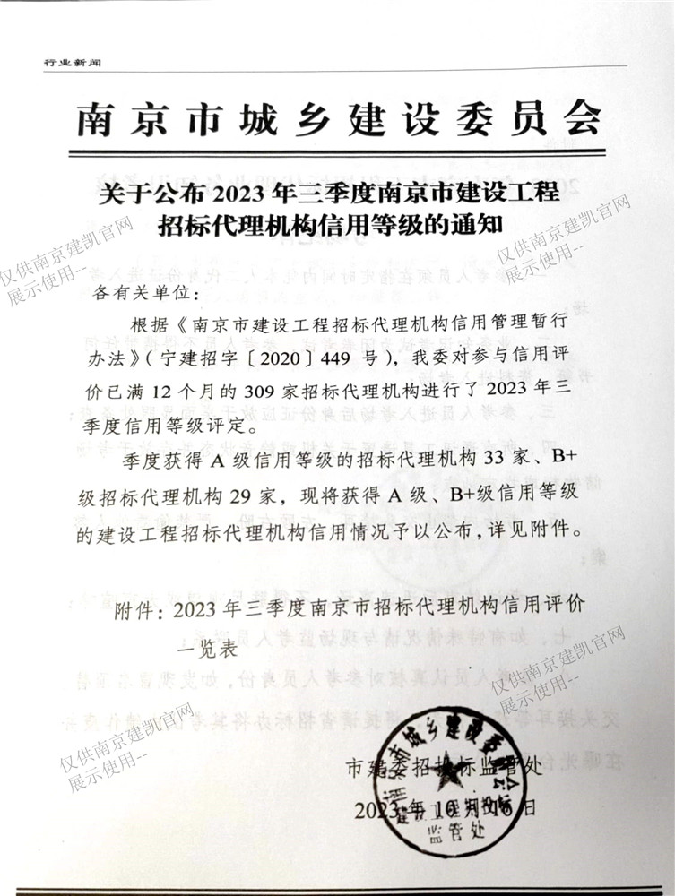 熱烈祝賀我司招標代理機構在“2023年三季度南京市建設工程招標代理機構信用評價(jià)等級A”